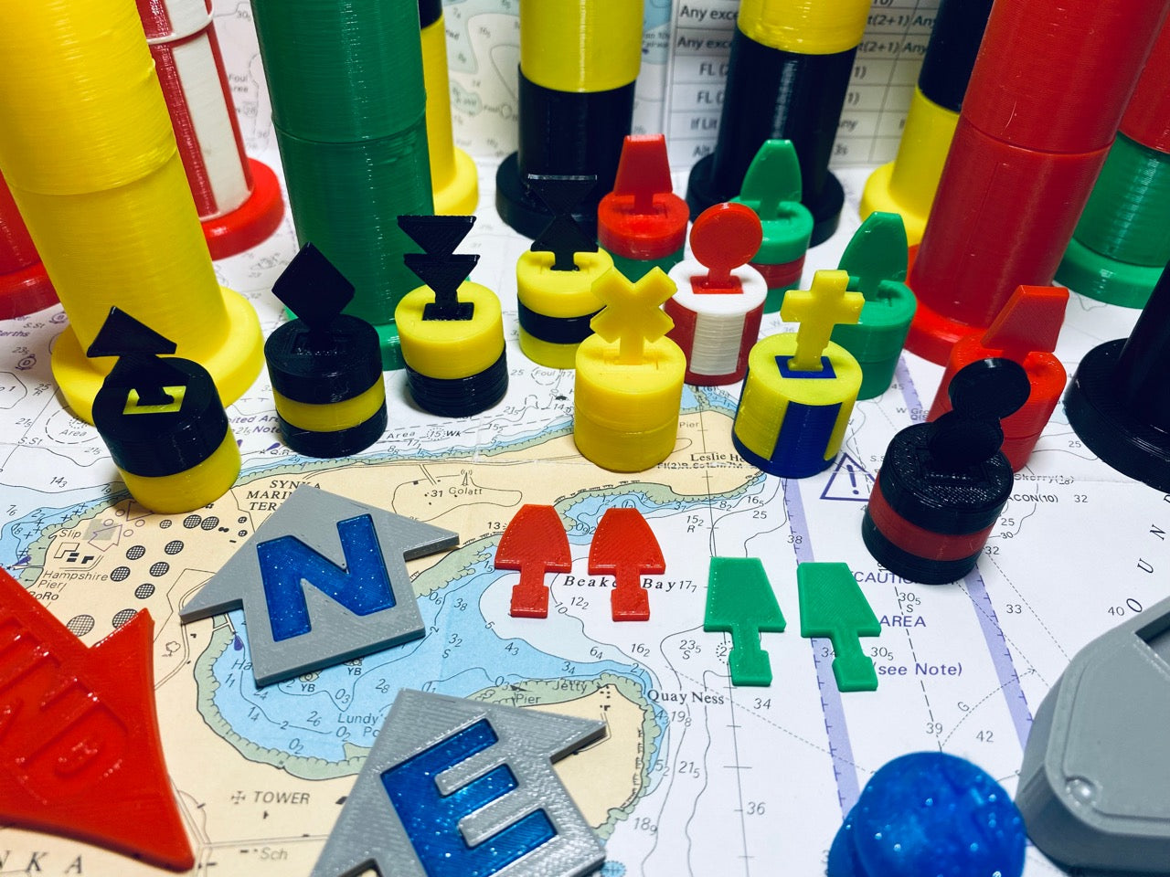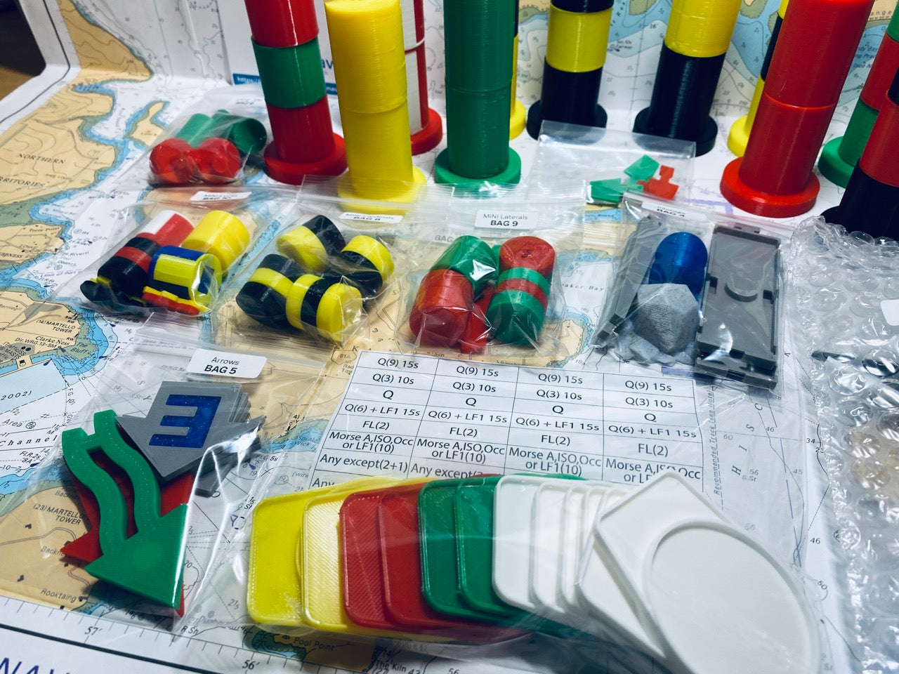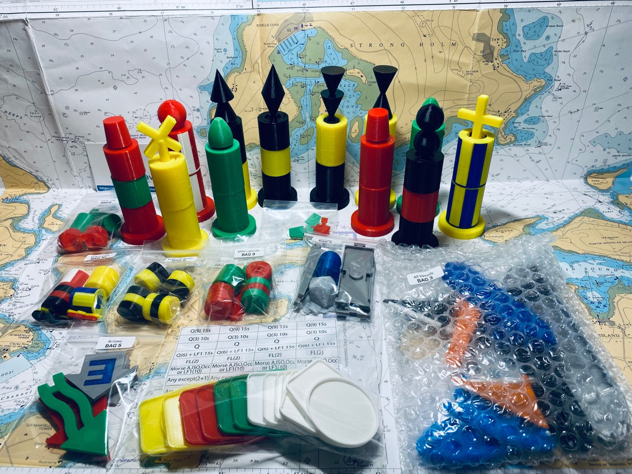 This is the Sea School complete IALA Buoy pack for Instructors, containing all twelve IALA-specific buoys (with BOTH Region A or B top shapes), plus the ‘light shoes’ and a sticker sheet for light characteristics – this set covers the vast majority of the cases that we encounter. This set also contains pilotage models and wind/current indicators from our pilotage system.